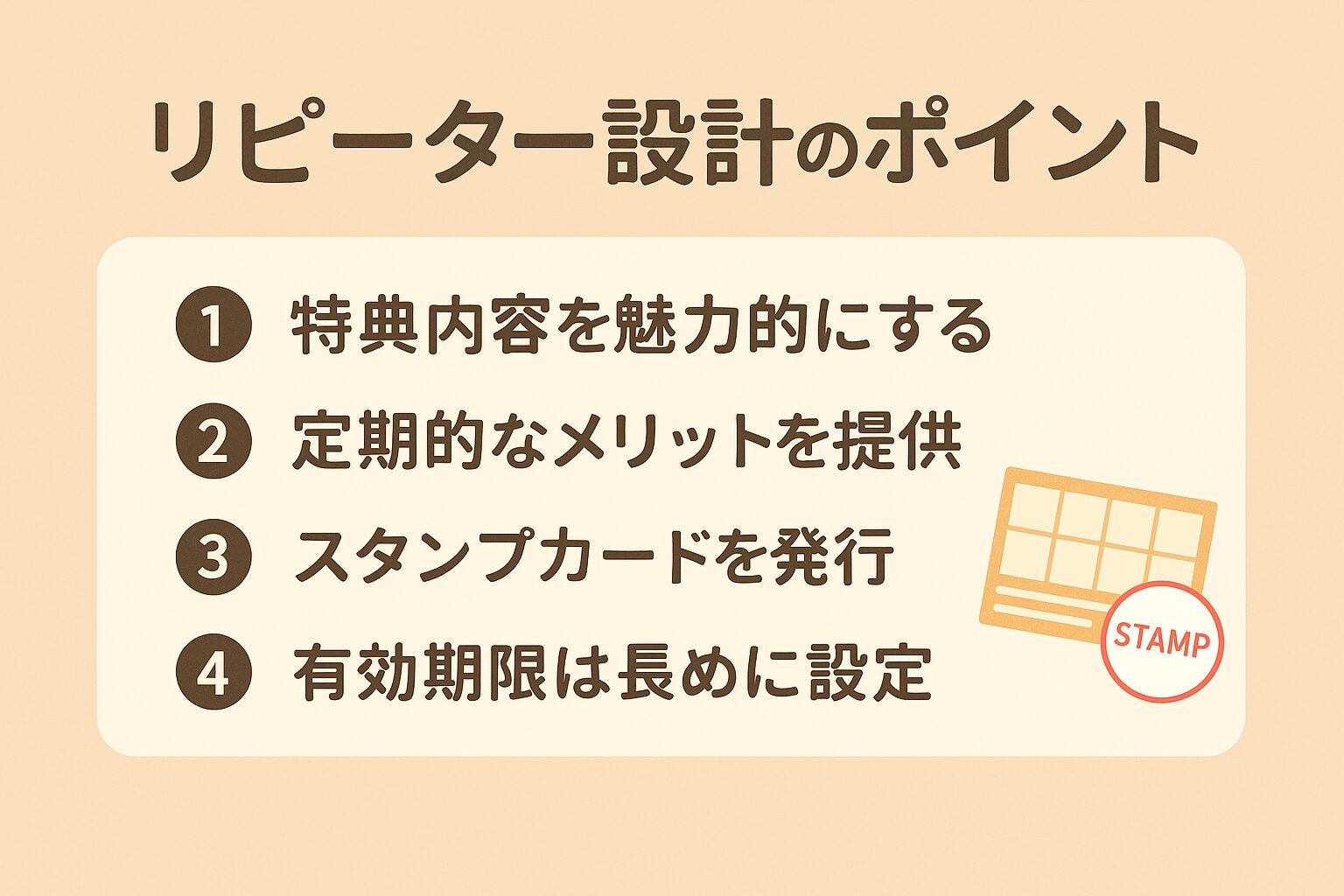 - スタンプ・特典・タイミングの3つを整えれば再来店率UP
